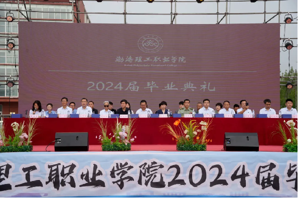 渤海新区黄骅市委常委、武装部政委吴高鹏同志,渤海新区黄骅市政府副市长张桂云同志,渤海新区黄骅市教育局局长何寿彪同志,学院理事长范松同志,学院院长张玉军教授,学院党委书记卢振启教授,学院常务副院长刘素芬教授,学院副院长谭景春同志、赵志峰同志、范伟同志,学院财务总监牛文勇同志,学院理事长助理李硕同志,沧州渤海新区黄骅市优秀企业家代表在主席台就坐。学院各部门领导,教职工代表和在校生、毕业生、毕业生家长参加了毕业典礼,典礼仪式由学院副院长董真真同志主持。
