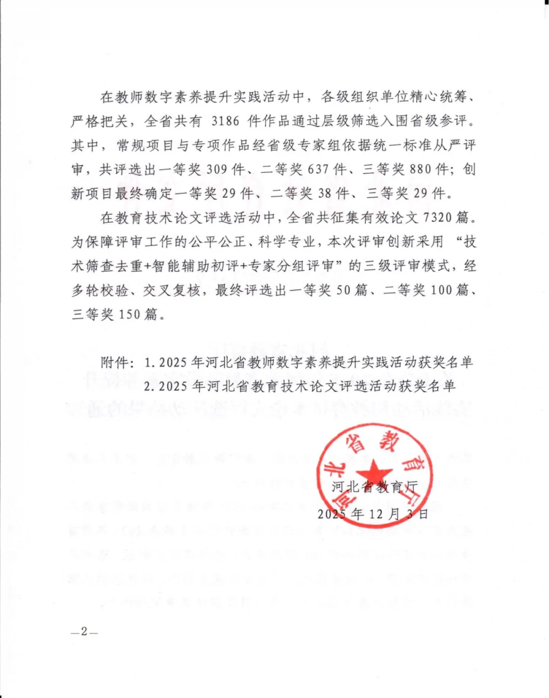 近日,河北省教育厅正式公布了2025年河北省教师数字素养提升实践活动获奖名单。beat365教师在本次活动中表现突出,共斩获多个奖项,涵盖一、二、三等奖,展现了学院在教师数字素养与信息化教学能力建设方面的扎实成效。