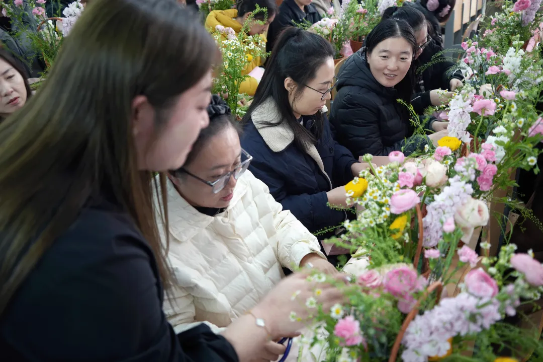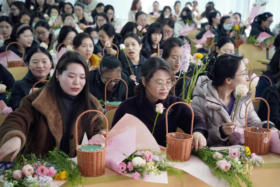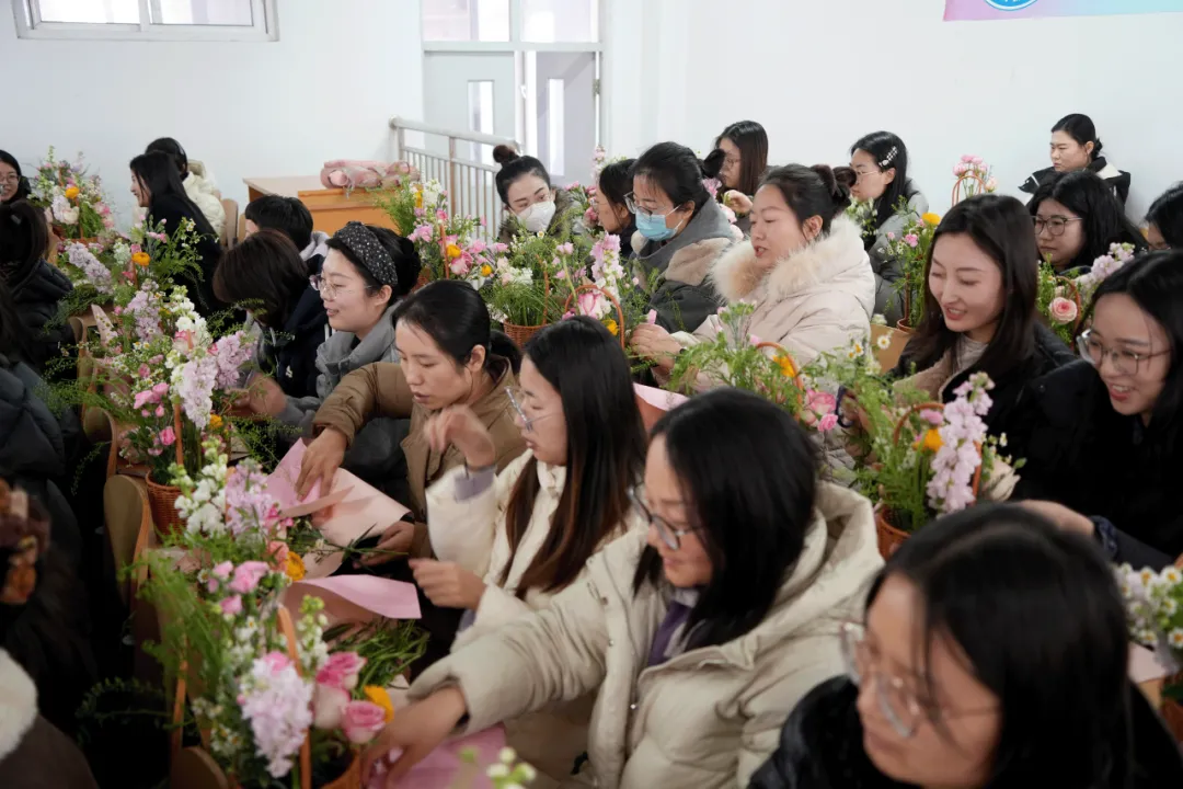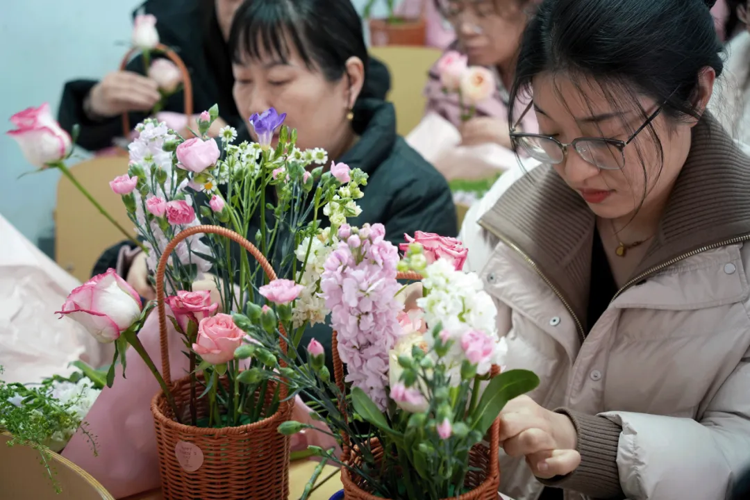 女教师们化身“花艺设计师”,选花、修剪、构思……指尖流转间,一篮篮风格各异的作品悄然绽放。花香袅袅,笑语盈盈,大家在创作中卸下疲惫,悦享美好时光。