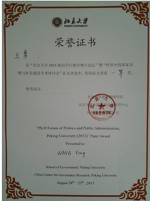 2013 年8 月24—25 日,新葡萄王勇教授应邀参加了“北京大学2013 政治学行政学博士论坛”暨“转型中的国家治理与社会建设学术研讨会”,作了“空间层化与国家建构——中国的历史与经验”的主题演讲,同时担任“基层治理:困境与突围”分组讨论主题主持人。会议闭幕时,会议组委会宣布了此次会议征文评奖结果,王勇教授的论文荣获一等奖。