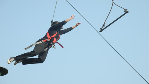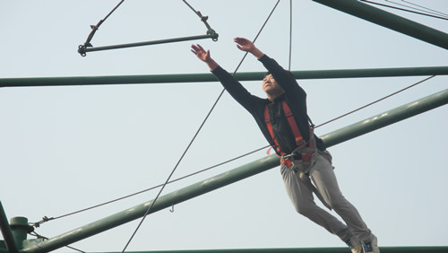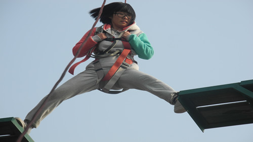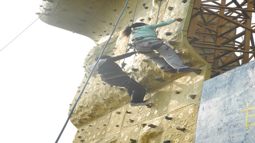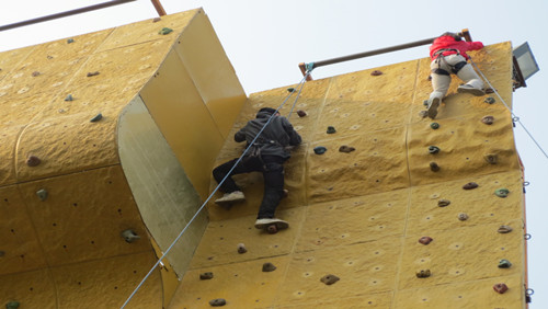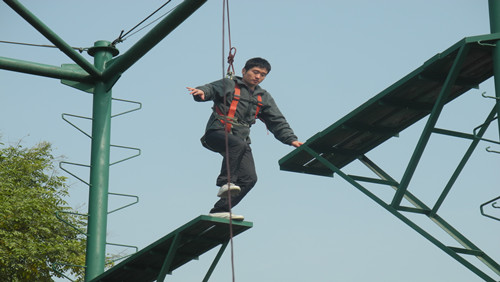 此次素质拓展训练的项目主要有:攀岩、高空断桥与高空抓杠、信任背摔和“抢渡金沙江”等。其中每个项目的设计意在使体验者战胜与超越自我,重点突出对大学生意志品质和团队协作精神的锻炼与培养。如攀岩,攀上14米高的悬岩峭壁,既要有充足的体力保证,又需要四肢的灵巧互动,更要具备克服恐高心理的勇气和信心;高空断桥与高空抓杠,要在10米高空跨越宽50公分、中断近一米的断桥,凌空跃起攀抓悬空的单杠,更是考验着同学们的胆识与魄力;信任背摔与“抢渡金沙江”,要求同学们在克服恐惧、战胜和超越自我的同时,更需要从内心建立起对整个安全保障团队的高度信任。尤其是“抢渡金沙江”,10名“战士”每两人一组形成“桥墩”,双方双臂相互紧扣形成井字形“桥面”,架起一座横跨“金沙江”两岸的坚固人“桥”,27名“战士”在“枪林弹雨”之中从“桥”上冲过,当年中国工农红军抢渡金沙江的英勇场面不由得浮现在眼前。活动进行中,架“桥”的同学们发挥特别能忍耐、特别能吃苦、特别能战斗的精神,手臂被踩麻了,甚至被踩破了,却没有一人喊苦喊累,没有一人退缩。“桥”上的同学们踩着脚下的同学,虽然心在痛,腿在颤,感受到的却是无尽的信心、勇气和力量。此时此刻,恒心、耐心、爱心、信心一并在无限升华……