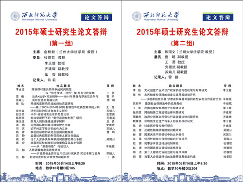 近日, 新葡萄8883官网AMG2012级硕士研究生论文答辩会分别在学院204会议室和105教室举行。本届研究生毕业论文答辩分两个组进行,答辩委员会主席分别由兰州大学新葡萄8883官网AMG俞树毅教授和陈国文教授担任,答辩委员由杜睿哲教授、李玉璧教授、王勇教授、曹明副教授、苏婉儿副教授、齐建辉副教授、张芸副教授和党崇武副教授8位导师组成。法学院31名研究生参加了论文答辩。