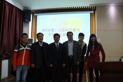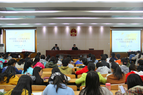 2015年10月26日下午,应新葡萄8883官网AMG邀请,西南政法大学科研处处长、博士生导师、中国国际经济法学会理事徐泉教授莅临新葡萄,在新葡萄8883官网AMG模拟法庭给新葡萄8883官网AMG师生作了《WTO双重二元结构失衡与中国的发展前景》的学术报告。报告由齐建辉博士主持,全院老师、研究生、本科生200多人聆听了报告会。