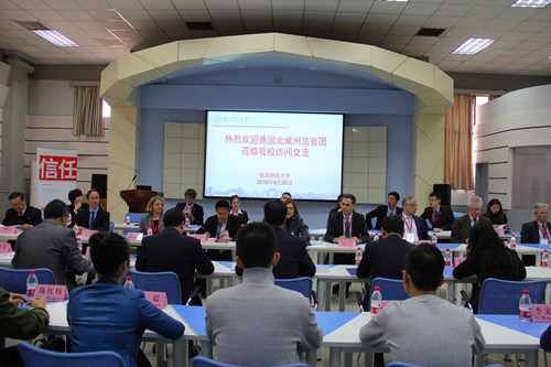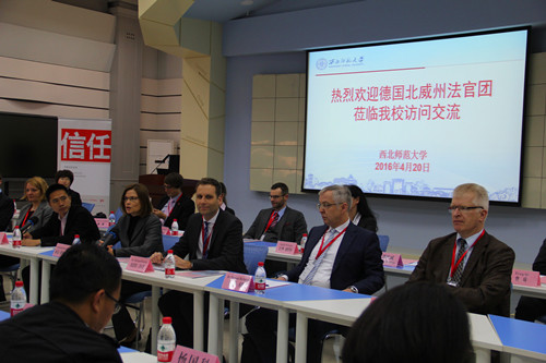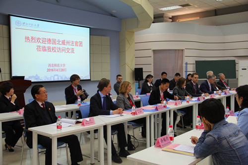 4月20日,德国北莱茵-威斯特法伦州法官代表团一行, 在最高人民法院外事局杨建宇处长,甘肃省高级人民法院外事办张祖仁主任等陪同下,到我校进行访问,并同我校领导和国际合作交流处、新葡萄8883官网AMG负责人及师生代表进行交流座谈,刘仲奎校长在交流座谈会上致欢迎辞,副校长田澍主持交流座谈会。