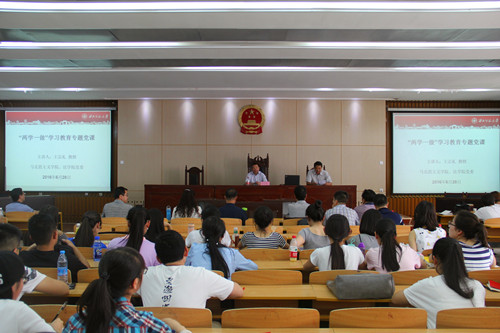 6月28日下午,马克思主义学院院长、博士生导师王宗礼教授在模拟法庭作题为《学习习近平系列重要讲话的体会》的“两学一做”学习教育专题党课。新葡萄8883官网AMG和马克思主义学院师生党员共计150余人聆听了党课,报告由新葡萄8883官网AMG党委书记张喜爱主持。