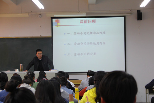 车亮亮老师主讲《劳动与社会保障法》中 “劳动合同的订立与形式”。授课时,车老师首先引导学生回顾了有关劳动合同的知识,并通过课堂提问的形式导入新课的学习,进而提出五大教学目标,随后围绕劳动合同法的相关规定,结合现实劳动合同订立中存在的种种问题进行深入的分析与讨论。