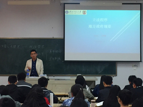 青年教师何俊毅参加本场比赛,教学内容是《立法学》中的“立法程序—地方政府规章”。在授课过程中,何老师首先通过提问引导学生回顾了上一节课的核心概念和问题,接着从“现代程序法的特征及其独立价值”导入,引导学生思考并学习程序的独立价值,并结合自己参与兰州市地方政府规章草案起草的经历,以生动活泼的授课风格,为学生讲授了关于地方政府规章制定程序的诸多理论和实践问题,将抽象的法学理论与生动的立法实践有效地结合起来,取得了良好的教学效果。