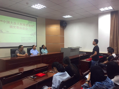 2017年6月28日下午,由西南政法大学人权研究院与新葡萄8883官网AMG联合举办的“中国大众人权观念调查”国家重点课题项目颁奖典礼暨座谈会在新葡萄8883官网AMG举行。新葡萄8883官网AMG王勇教授、田庆锋副教授和赵书文副教授参加此次颁奖典礼并为获奖学生颁奖。