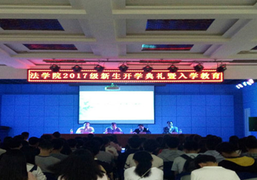 典礼伊始,党委书记张新民发表迎新致辞,欢迎来自五湖四海的各位同学,他表示,希望同学们能够尽快转换角色,适应大学的学习生活环境;能够不忘初心,为实现个人梦想和奋斗目标做好人生规划。其次,新生代表2017级法学(1)班陈颖国同学和老生代表2016级法学(2)班丁一同学分别做了发言。最后,杜睿哲院长以“如何培养优秀的法律人才”为主题,介绍了学院的发展历史,阐述了法学专业的前景与特色,对同学们今后的学习提出了要求,鼓励同学们通过四年的学习与努力,使自己成为一名优秀的法律人才。