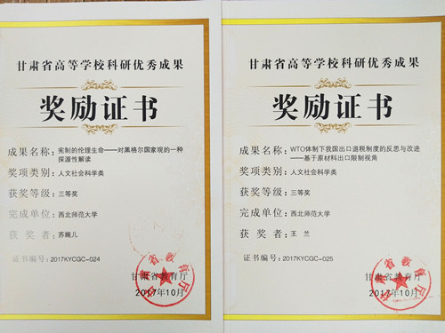 日前,甘肃省教育厅公布了2017年度甘肃省高等学校科研优秀成果奖获奖名单,西北师大共有38项科研成果获奖,其中一等奖8项、二等奖12项、三等奖18项。新葡萄教师李玉璧(团队成员:王勇、2016级法律硕士研究生李倩等)和王勇(团队成员:齐建辉、赵书文)分获一等奖,苏婉儿、王兰、车亮亮三位老师分获三等奖。