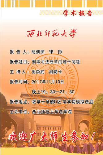 各位师生:应我校新葡萄8883官网AMG邀请,北京京佃律师事务所主任纪佃澎律师将于11月10日来我校做学术报告,欢迎广大师生参加!报告具体事宜安排如下: