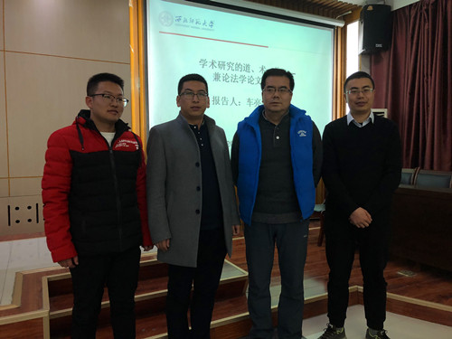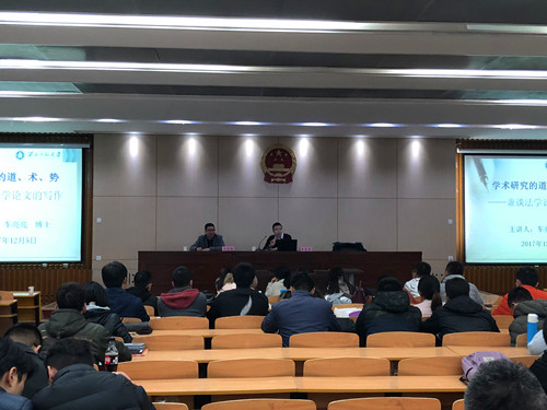 报告会伊始,车亮亮博士结合我校校训“知行欲圆,行旨须直”,提出了“我们的出路在哪里?”这样一个发人深省的问题,然后从我校的身份定位、培养目标、历史传统等方面进行解读,进而指出我们的出路在于:“脚踏实地,仰望星空;不盲目自信,不妄自菲薄”,以激励在座的广大学子深稽博考、潜精研思。接着,车亮亮博士直入报告主题,结合法学论文的写作,从“何谓道、术、势?学术研究中的道、术、势以及学术研究如何贯通道、术、势”等方面展开本次报告会。首先,车亮亮博士指出道是宇宙间的一切法则和道理;术是求道问道之工具及通向道的方法策略、技艺技能和学术主张;而势是事物发展演变的动态趋势。其次,学术研究之道,是指一篇学术论文的中心思想和核心命题,乃学术之灵魂、根本出发点和最终归宿;学术研究之术,是学术研究的方法和方法论;而学术研究之势,是指贯穿全文的气,学术研究之气当势如破竹、气贯长虹。学术研究之要旨在于明道、优术、取势!再次,法学学术研究要想贯通道、术、势,需要做好法学论文的选题(四原则:有意义、有兴趣、有想法、能驾驭)、明确法学论文写作的基本要求、基本思路和基本结构,并掌握法学研究的基本方法。最后,车亮亮博士还就法学论文写作中的注释和参考文献、文献综述的写作等问题给同学们进行了讲解。