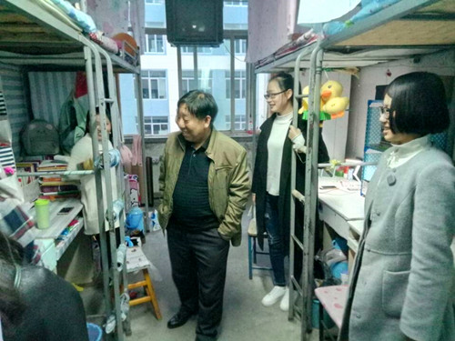 为做好2018年春季学期学生开学报到注册及安全教育工作,3月4日晚7点,学院党委书记张新民,辅导员赵小培,班主任张久相、叶建平、何俊毅及学生干部前往兰天公寓走访学生宿舍。