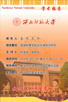 各位师生:应我校新葡萄8883官网AMG邀请,甘肃省人民检察院法律政策研究室主任金石同志将于3月15日来我校做学术报告,欢迎广大师生参加!报告具体事宜安排如下:
