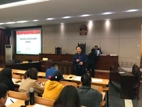 2018年11月1日,甘肃省高级人民法院行政庭在新葡萄8883官网AMG模拟法庭开展案件庭审活动,新葡萄8883官网AMG师生共同旁听了这场“特别”的庭审。庭审案件为“上诉人兰州有色冶金设计研究院有限公司、上诉人孙成华因被上诉人赖桂花诉原审被告兰州市国土资源局房屋注销登记上诉案”。庭审分四个阶段进行。