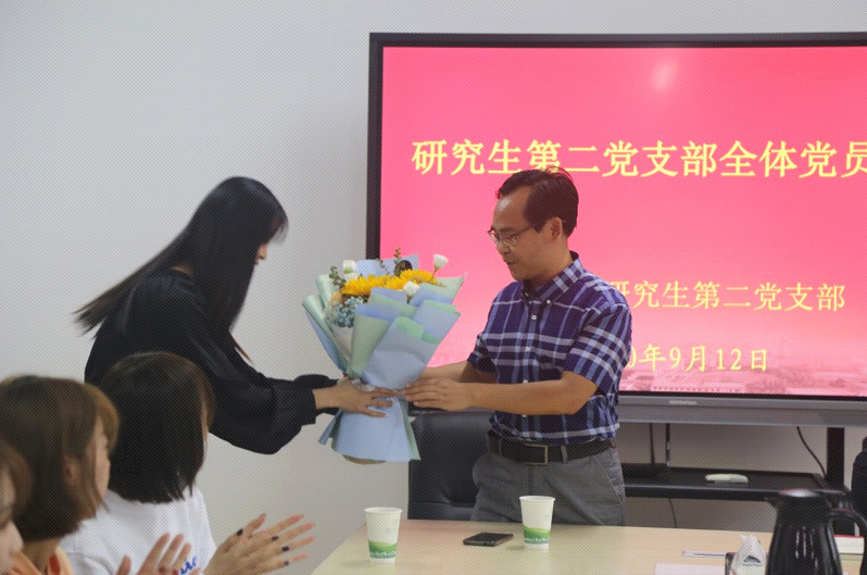 会议第六项,王嘉禧副书记代表全体党员与支委会向田老师对支部工作所作出的贡献表达了真诚的感谢,并由赵力苇同代表全体党员向田老师献上鲜花。