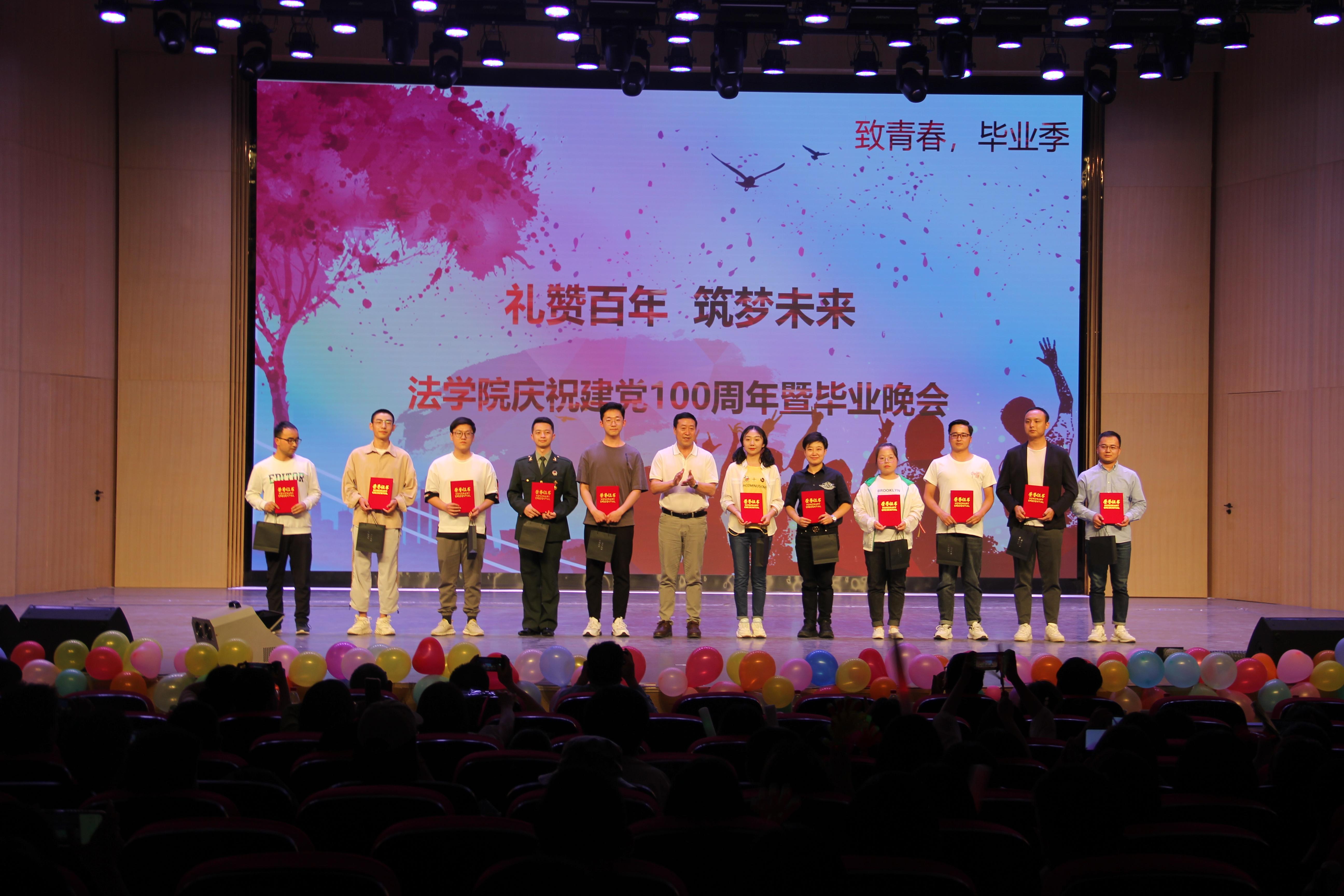 一段精彩的视频回顾了2021届毕业生在校园里学习、工作和生活的风采。三年或四年的时光转瞬即逝,然而同学们都留下了属于自己和学院的熠熠光辉。伴随着热烈的掌声,以动感的节奏和充满活力的舞姿拉开了本次晚会的序幕,燃爆全场观众的热情。2020级本科学生翩然起舞,曼妙的身姿让人印象深刻,有毕业班学生优美的歌喉引爆全场,用真情流露的《你好,兰州》诉说出对往昔的不舍与怀念。特别值得一提的是,副院长党崇武老师以一首《沁园春·长沙》在晚会中的倾情朗诵,希望广大的毕业生同学们要有乐观主义精神和以天下事为己任的豪情壮志。一部《刘巧儿婚嫁》话剧献给毕业生,演员全情投入,观众看得入迷,观众随着剧情的发展,掌声、笑声在音乐厅里起此彼伏。除此之外,本场晚会还穿插了抽奖环节,让现场参与的同学们大呼惊喜连连。最后,一曲《映山红》让空气中弥漫着浓浓的伤感和丝丝的不舍。晚会现场,党委书记李发军同志为2021届优秀毕业学子颁发了荣誉证书,既是对同学们在学院学习期间取得的成绩的高度认可,更是对一届又一届学生的鼓励与激励。