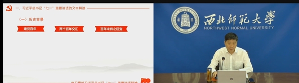 2021年是中国共产党建党一百周年,为进一步深入学习贯彻习近平“七一”重要讲话精神,将“四史”学习转化为育人成效9月7日开学之际,学校党委书记张俊宗主讲“学习习近平总书记‘七一’重要讲话——以青春之我强青春之国”为主题的本科生开学第一课