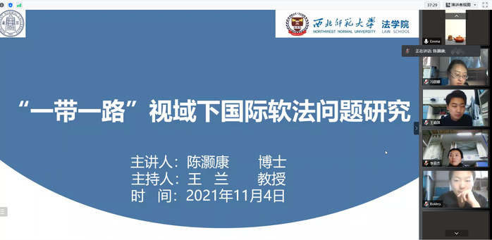 根据新葡萄8883官网AMG“研究生学术月”青年博士学术报告活动安排,2021年11月4日15时,新葡萄8883官网AMG青年博士陈灏康老师通过“腾讯会议”为新葡萄师生作了一场题为《“一带一路”视域下国际软法问题研究》的线上学术报告。该报告由王兰教授主持,新葡萄全体研究生在线聆听了此次报告。