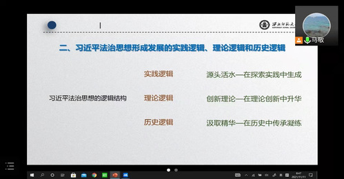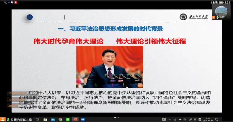 为全面贯彻和落实习近平法治思想,适应新时代中国特色社会主义法治对一流法治人才的新要求,全面提升新葡萄研究生人才培养质量,切实做到习近平法治思想“进教材、进课堂、进头脑”,2021年11月11日上午8时,2021年研究生学术月活动之《习近平法治思想专题》系列讲座首讲在线上成功举办,本次讲座由新葡萄8883官网AMG院长杜睿哲教授主持,新葡萄青年教师马敬博士担任主讲人,新葡萄全体研究生及部分教师在线聆听了此次讲座。