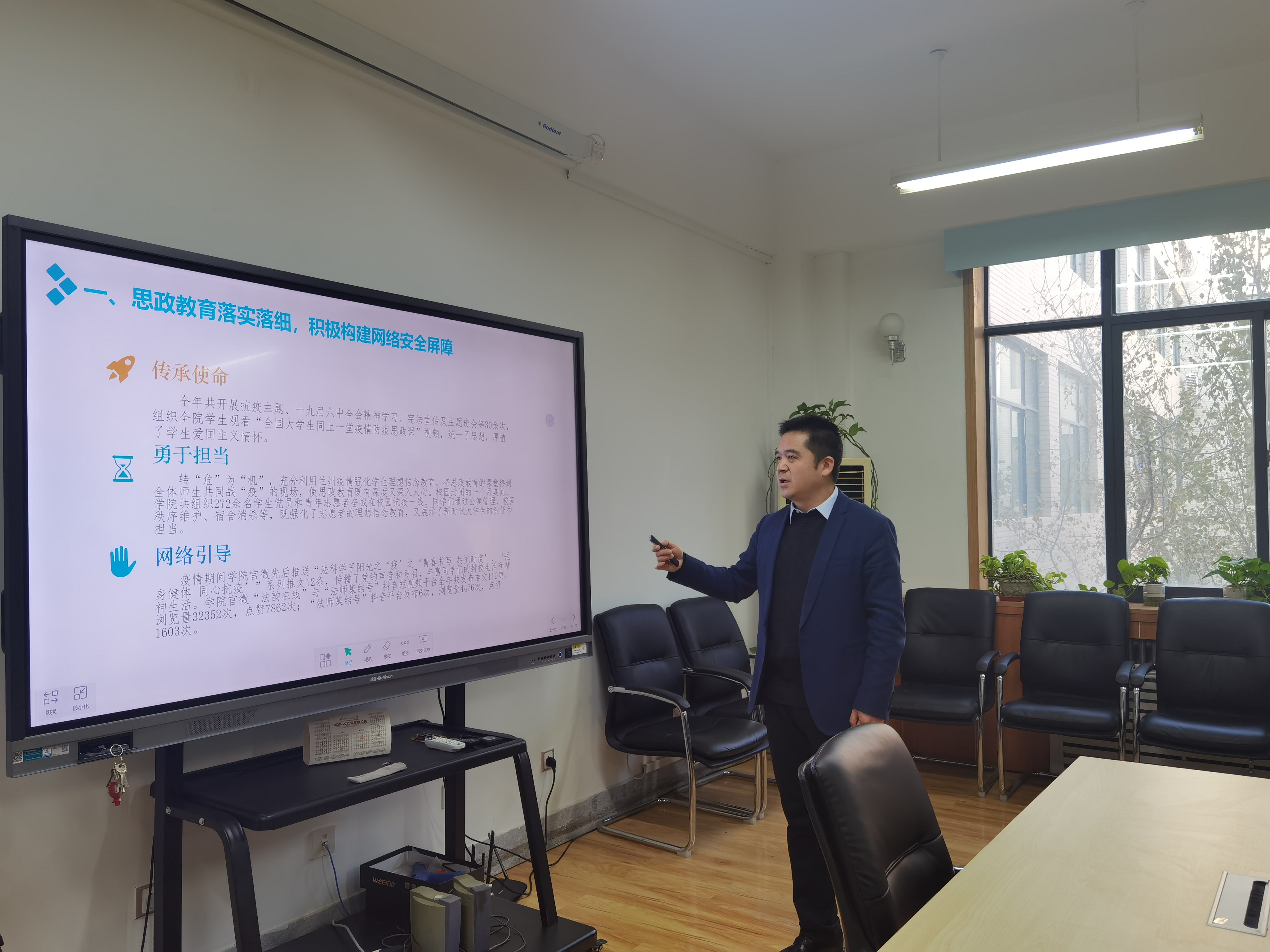 会上,王金元老师首先对学院2021年学生工作从“思想教育”“制度建设”“专业发展”“党建引领”“管理服务”“责任担当”“奖助育人”“服务社会”和“学工发展”等八个方面做了汇报,在总结成绩的同时也指出了当前学院学生工作中存在的问题和不足,要求全体班主任要进一步统一思想认识,提升管理水平,打造一支“作风优良、学生安全、保障有力”的班主任工作队伍。结合岁末年初、学校期末考试、元旦放假、冬季事故易发多发等特点,王金元老师对学期末考试纪律、心理健康教育、冬季安全防护以及假期疫情防控工作做了细致安排,希望大家再接再厉,认真细致做好各项收尾工作,圆满完成全年工作任务。