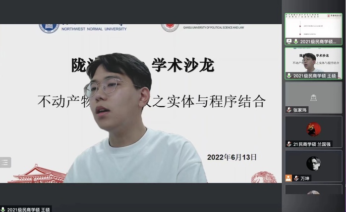 为加深新葡萄8883官网AMG与甘肃政法大学民商经济新葡萄8883官网AMG之间的学术联系,提高两学院研究生科研能力和学术水平,2022年6月13日晚七点,两学院以线上会议的方式共同举办首次“陇法争鸣·学术沙龙”活动,本次学术沙龙的主题为“不动产物权期待权之实体与程序结合”。两学院张家玮等四名研究生学生作主题发言,张国文等四位老师做研讨点评。本次沙龙由学生主持,两学院师生线上参与此次学术沙龙。