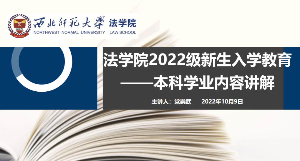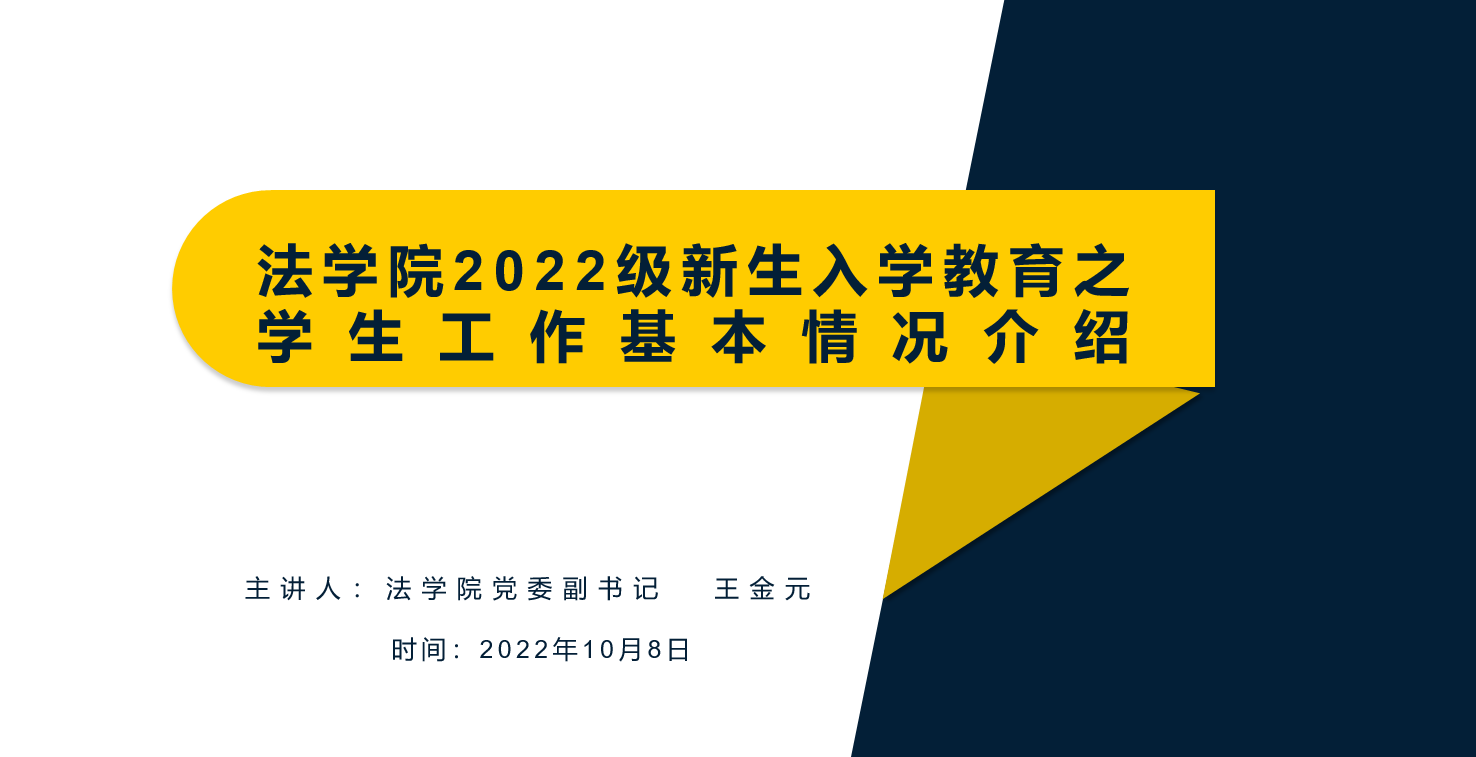 入学教育系列活动采用学生入校报到后线上集中入学教育专题讲座、班级分散教育和恢复线下教学后常规入学教育工作相结合的形式。其中,10月8日至11日组织开展的线上集中入学教育工作中,学院院长何俊毅,党委副书记王金元,主管本科教学工作副院长党崇武,专职辅导员白洁和保研至北京大学19级法学2班的孙袁媛围绕“知院史、弘传统、守规矩、做新人”主题,在学院人才培养体系、学生教育管理服务工作、资助政策、违纪违规处理办法、学生安全教育、预防电信网络诈骗、优秀学生代表经验分享等方面作了专题报告,同时和新生进行了答疑交流,帮助新生尽快融入大学生活,顺利完成角色转变。