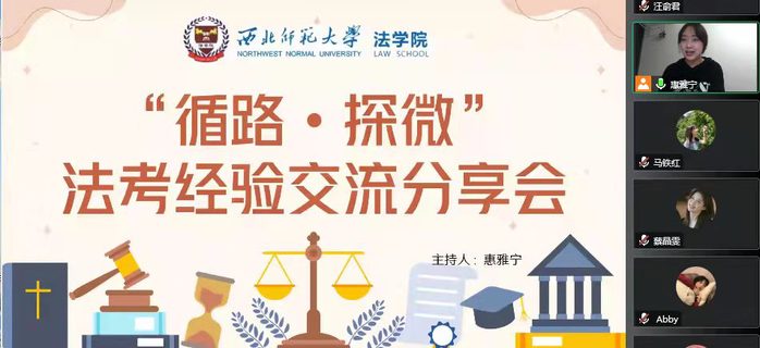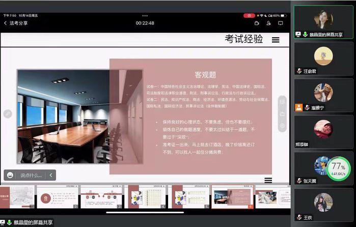 2022年10月14日,为帮助新葡萄8883官网AMG同学科学高效备考,学院邀请了四位成功获得法考A证的同学,以线上会议的形式,分享她们在备考时的经验。
