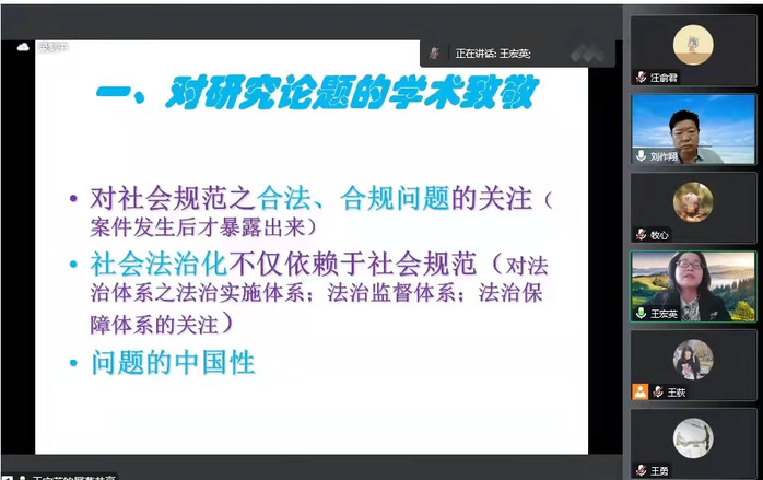 10月20日下午,应新葡萄8883官网AMG邀请,中国法学会法理学研究会副会长、上海师范大学刘作翔教授在线作题为《社会规范的备案审查制度》学术报告。本次报告由新葡萄8883官网AMG何俊毅院长主持,王勇教授、牛绿花教授、王宏英教授、齐建辉副教授参与讨论,学院三百余名师生在线聆听。