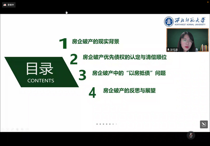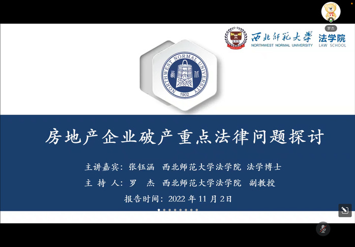 2022年11月2日晚,新葡萄8883官网AMG“研究生学术月”青年博士论坛如期召开,青年博士张钰涵老师以线上会议的形式,为全院同学作了一场题为“房地产企业破产重点法律问题探讨”的学术报告。本次报告由罗杰副教授主持,李泉老师参与讨论,新葡萄一百余名同学聆听了此次讲座。