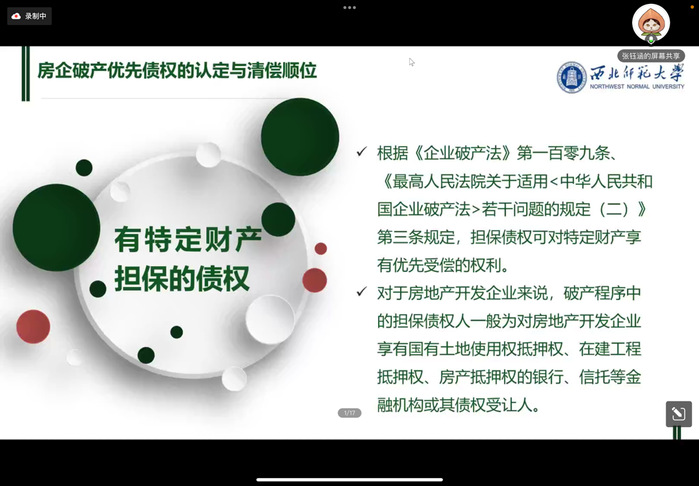 张老师从立法、学界、司法实务等角度说明了破产法律制度的重要性现存困境,并强调了房地产行业对于社会的重要影响、目前的严峻形势以及化解其危机的重要性。接着从房企破产的现实背景、优先债券的认定和清偿、“以房抵债”问题以及反思与展望个方面展开。首先,张老师从“房住不炒”、“三条红线”、“保交楼 稳民生”三个关键词入手,介绍了房企的基本现状;并通过“销售降”、“投资弱”、“融资难”三个关键词阐述目前房地产市场的总体特征;再通过“供求易势”、“疫情冲击”、“预期转弱”三个关键词介绍房地产市场面临的三重压力。然后张老师围绕房企破产中的两个重点问题进行讲解和梳理。对于房企破产优先债权的认定与清偿顺位问题,张老师先从总体上阐述了房企破产债权的受偿顺序,接着分别对商品房消费购房者的“超级优先权”、建设工程价款优先、有特定财产担保的债权进行梳理,进一步解释了如何甄别优先财产范围。第二个问题是房企破产中的“以房抵债”问题,张老师结合《企业破产法》等相关法律法规司法解释,对以房抵债进行学理分析、以房抵债的一般认定、以房抵债特殊认定规制具体情形进行讲解。最后,张老师对房企破产进行了反思和展望,认为当前经济下行、疫情冲击等多种因素导致房企经营困难,可以通过行政和司法两种途径对房企破产进行规制,并从充分认识市场作用、深化府院联动、采取预重整模式以及完善相关立法等方面提出建议。