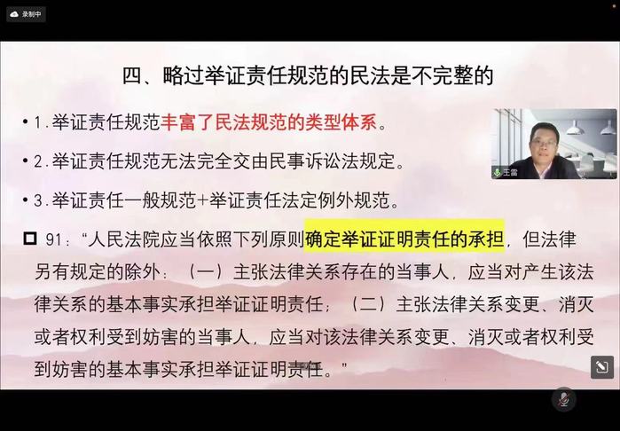 王教授提出,略过举证责任规范的民法是不完整的,因为举证责任规范丰富了民法规范的类型体系,并且举证责任规范无法完全由《民事诉讼法》规定。随后,王教授详细阐述了举证责任规范的新发展,他认为降低证明标准可以缓解举证责任一般规范和倒置规范僵化的现状,并且应该区分不同诉讼阶段的举证责任和证明标准、区分实体事由和程序事由的证明标准、区分本证和反证的举证责任和证明标准以及区分请求、抗辩、再抗辩等对应的举证责任。最后,王教授认为举证责任规范并非民法证据规范的全部,提出民事立法应当有意识地、体系化地配置举证责任规范,并且要在解释论上认真地对待广义证据规范。
