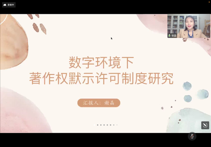 20221114日晚,新葡萄8883官网AMG“研究生学术月”青年博士论坛如期召开,青年博士谢晶以线上会议的形式,为全院同学作了一场题为《数字环境下著作权默示许可制度研究》的学术报告。本次报告由吴迪老师主持,李玉璧教授参与讨论,新葡萄一百余名同学聆听了此次讲座。
