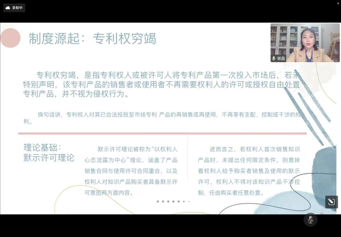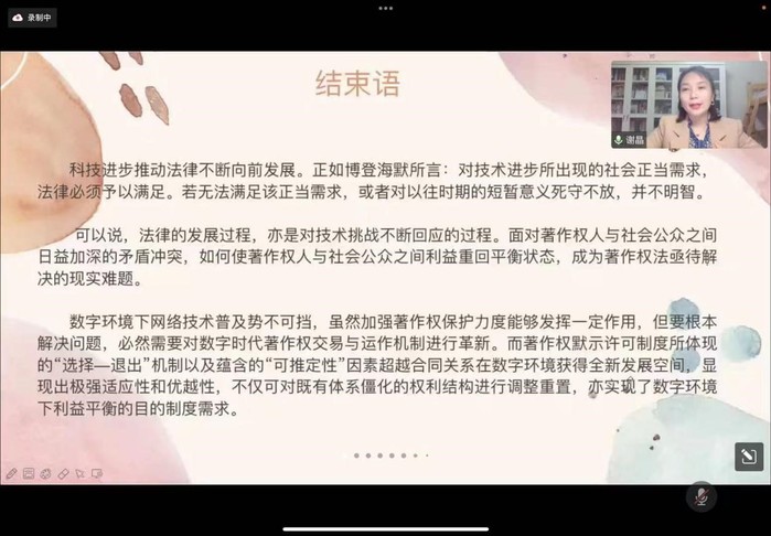 谢老师主要从数字环境下著作权默示许可制度的基本概述、域外考察、现状检视以及应然安排四个方面展开论述。第一部分,谢老师介绍了著作权默示许可的基本概念;总结了民法领域的默示行为、合同法领域的默示条款、知识产权法领域的默示许可以及著作权法中的默示许可在数字环境下对合同关系的超越,并以此来阐述著作权默示许可制度的发展和演变;还对知识产权法领域的默示许可制度分别从制度源起(专利权穷竭)、显性制度(发行权一次用尽)以及隐形制度(作为合同条款的补充)作了进一步解释。谢老师从当前困境和现实需求两个角度出发,概括分析了数字环境下著作权默示许可制度面临的新形势。在第二部分,谢老师总结提炼了英美法系和大陆法系关于著作权默示许可制度的发展演进,并以FieldGoogle案、Google图书馆案两个典型案例论述了美国数字环境下著作权默示许可制度的初次实践和再次探索。第三部分中谢老师详细介绍了我国著作权默示许可制度的立法现状、司法实践以及制度建设在宏观、中观、微观层面的不足。第四部分,谢老师提出数字环境下我国著作权默示许可制度的应然安排,即明确数字环境下著作权默示许可制度的构成要件、界定数字环境下著作权默示许可制度的具体范围以及构建数字环境下著作权默示许可制度的配套措施。