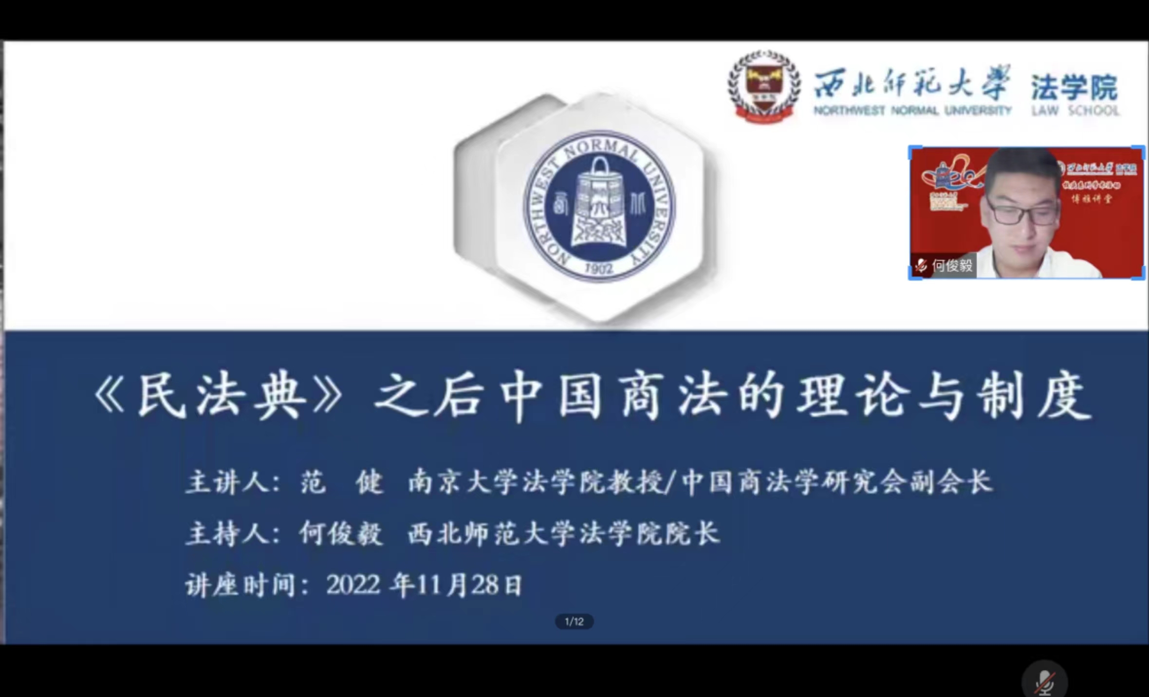 2022年11月28日,新葡萄8883官网AMG邀请南京大学新葡萄8883官网AMG教授、澳门科技大学新葡萄8883官网AMG特聘教授、博士生导师,南京大学商法研究中心主任、中国商法学研究会副会长、亚洲商法研究院(新加坡)理事范健作《<民法典>之后中国商法的理论与制度》专题报告。本次学术报告是由新葡萄8883官网AMG博雅讲堂资助的一百二十周年校庆、新葡萄8883官网AMG十周年院庆系列学术活动,由何俊毅院长主持,李玉璧教授、王兰教授和张钰涵老师作为与谈嘉宾交流研讨,学院约三百名师生在线聆听。