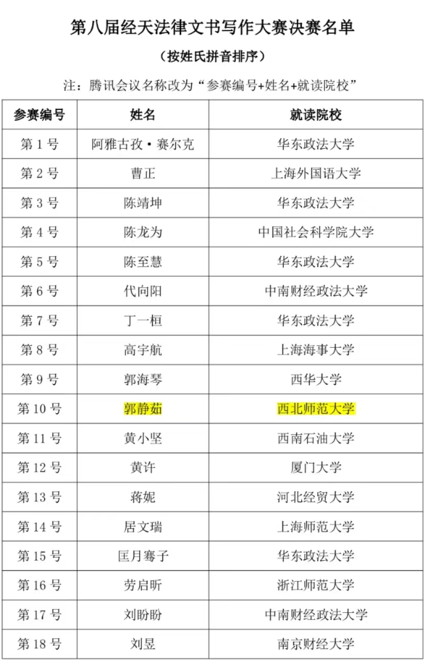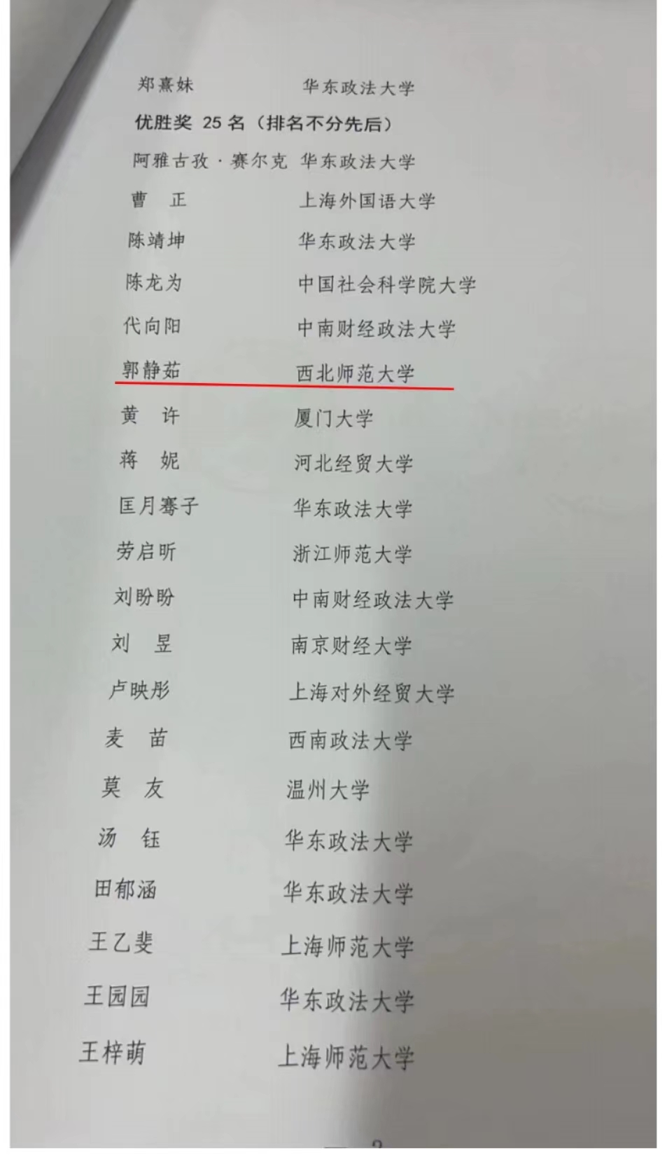 2022年11月27日,由上海市法律硕士专业学位研究生教育指导委员会主办,华东政法大学研究生院承办的第八届经天法律文书写作大赛落下帷幕。新葡萄2021级法律(法学)专业硕士研究生郭静茹荣获优秀奖,在该赛事上创造了新成绩。