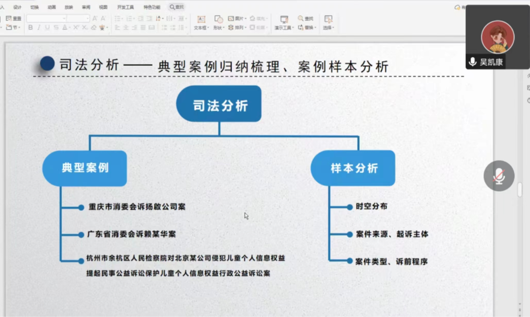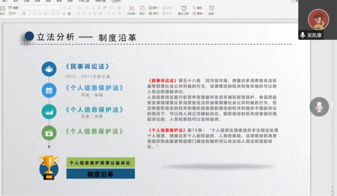 2022年12月12日晚,新葡萄8883官网AMG2022级法律法学研究生吴凯康同学作《个人信息保护民事公益诉讼起诉主体研究》的专题报告。本次学术报告是2022年“研究生学术月”系列学术活动之青年法学论坛,由张天翼同学主持,田庆锋教授和吴迪博士作为特邀嘉宾交流研讨,新葡萄8883官网AMG一百余位同学在线聆听。