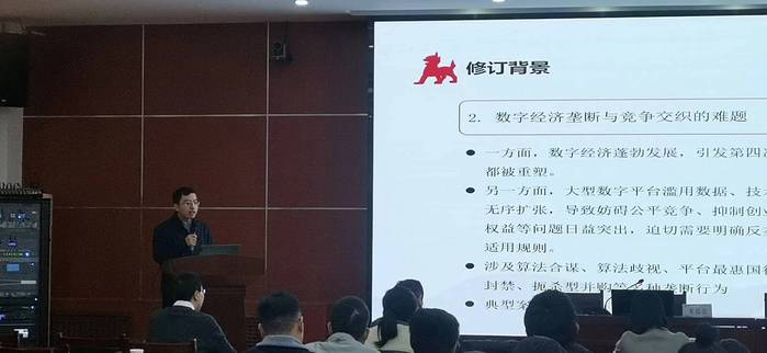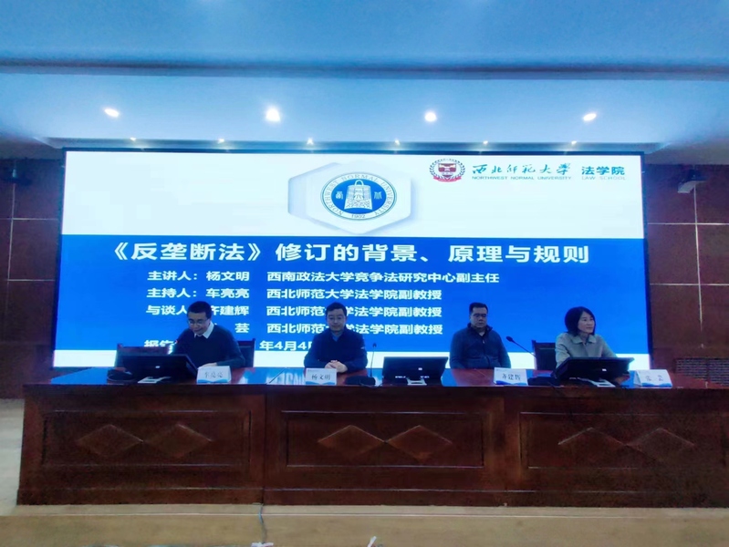 2023年4月4日,西南政法大学竞争法研究中心副主任、法学博士杨文明教授作《〈反垄断法〉修订的背景、原理与规则》专题报告。本次学术报告由车亮亮副教授主持,齐建辉副教授和张芸副教授作为与谈嘉宾交流研讨,新葡萄学生于模拟法庭聆听。