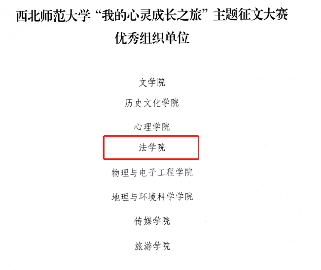 为进一步落实心理育人的教育理念,推广朋辈心理助人工作,提升学生心理健康素养,本学期始,学校心理健康教育服务中心与学校团委联合开展了面向全校本硕博学生的“我的心灵成长之旅”主题征文大赛,经过学院的有效组织,同学们踊跃参加,并在此次征文活动中获得一等奖1项,二等奖2项,三等奖2项,学院获“优秀组织单位”荣誉称号。