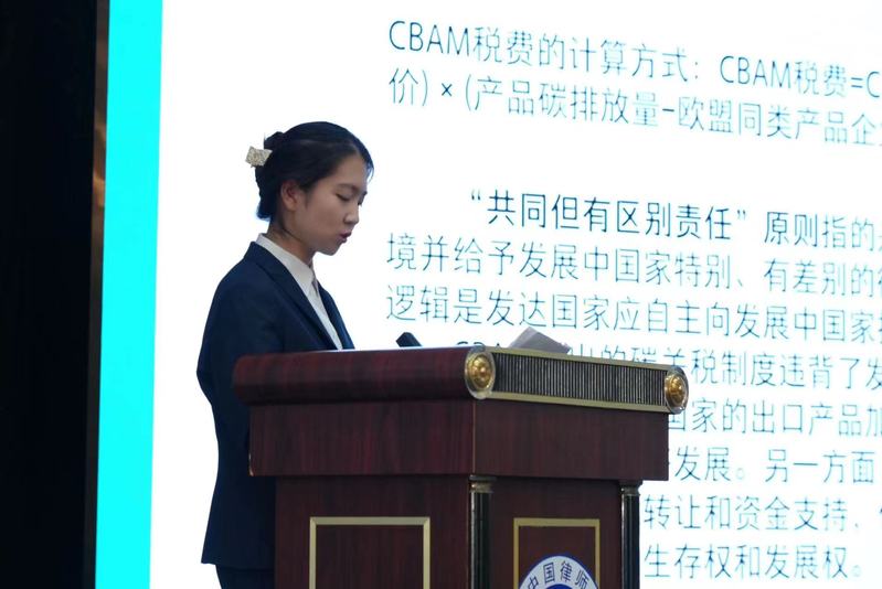 在学术交流环节,朱禾同学以《共同但有区别责任原则视域下欧盟碳边境调节机制的再检视及中国因应》为题作主题发言。从共同但有区别责任原则的视角出发,分析了欧盟碳边境调节制度(CBAM)对气候正义的内在要求,回顾共区原则的基本内涵及其演变,强调发达国家和发展中国家在减排责任分担上应有所区别,探讨共区原则与 CBAM 的矛盾,指出 CBAM 未充分考虑发展中国家的特殊情况和能力,提出中国应对 CBAM 的策略。