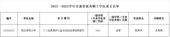 由新葡萄车亮亮老师指导,2020级法律硕士阮英华同学撰写的硕士学位论文《个人信息保护公益诉讼的法律适用研究》被评为2022—2023学年甘肃省优秀硕士学位论文。