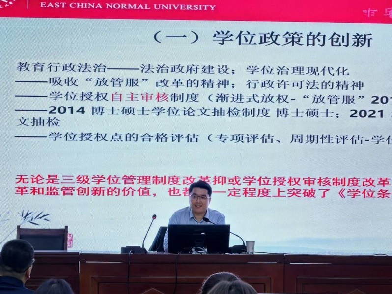 姚荣副教授围绕“中国特色学位法治道路是什么、如何形成(三重进路)”“为何需要出台《学位法》(从需要法律制度走向良法善治)”“《学位法》制定背景下,应该如何定位《学位法》的属性和功能(两种改革进路、五种基本功能)”三个维度展开讲座