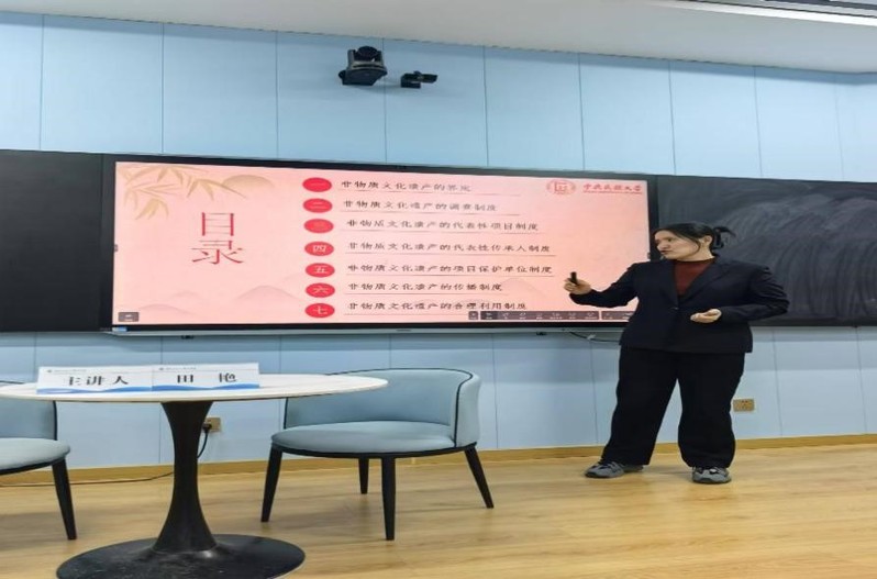 田艳教授围绕“非物质文化遗产的界定、非物质文化遗产的调查制度、非物质文化遗产的代表性项目制度、非物质文化遗产的代表性传承人制度、非物质文化遗产的项目保护单位制度、非物质文化遗产的传播制度、非物质文化遗产的合理利用制度”等方面进行了讲述。