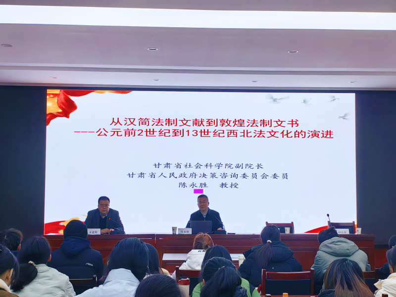 2024年12月11日,甘肃省社会科学院副院长、博士生导师陈永胜教授应新葡萄8883官网AMG邀请,以“从汉简法制文献到敦煌法制文书——公元前2世纪到13世纪西北法文化的演进”为主题,在模拟法庭为新葡萄师生作了专题学术报告,报告会由齐建辉副教授主持,学院王勇教授、田庆锋副教授等与谈。