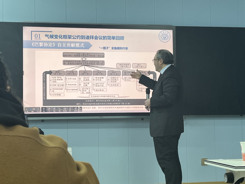 讲座伊始,曾文革教授从全球气候法制进程的角度出发,系统回顾了从《气候变化框架公约》到迪拜会议的重要节点,梳理了全球气候治理的演变脉络。他详细分析了《京都议定书》的强制减排模式及其局限性,并进一步阐述了《巴黎协定》提出的自主贡献模式如何为全球气候治理注入了新的活力。