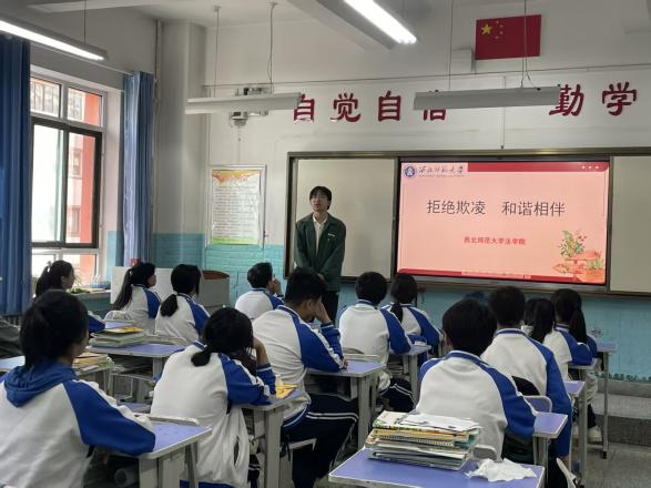 4月14日下午,新葡萄8883官网AMG党委副书记雷春芳、团委书记白洁、青年志愿者协会指导教师黄海燕带领12名普法宣讲团成员走进兰州市第十二中学,开展了“抵制校园霸凌 法律守护青春”为主题的普法宣讲活动。