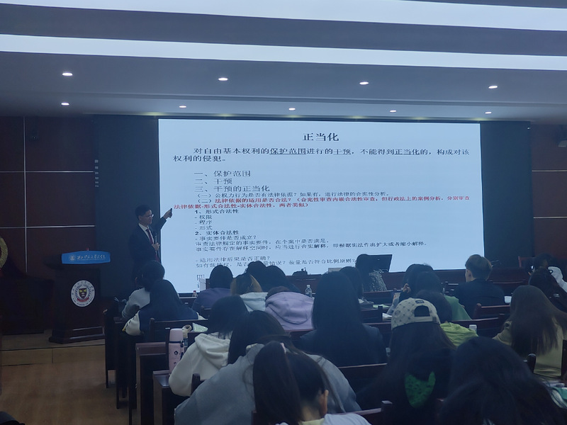 讲座中,谢立斌教授以“公民权利与公权力边界”为主线,结合丰富案例深入阐释宪法案例分析原理。他首先以“交警调取事故当事人通信记录”为例,解析公权力干预公民通信自由的合宪性审查要点,强调“法律保留原则”与“比例原则”的核心地位。通过对比《A省道路交通安全条例》与宪法第40条,谢教授指出:“公权力行使须以明确法律授权为前提,且手段需与目的相称。”针对“地铁站警察查验身份证”这一高频争议场景,谢教授现场还原案情,引导听众运用“自由权分析框架”逐步推演:从“保护范围是否涉及人身自由权”“查验行为是否构成干预”,到“法律依据的合宪性审查”,层层拆解中,《中华人民共和国居民身份证法》第15条与《城市人民警察巡逻规定》的适用边界得以明晰。他特别提醒:“执法者应精准援引法律条文,公民亦需理性行使监督权,二者共同筑牢法治社会的信任基石。”除具体案例分析外,谢立斌教授现场演示如何通过“定义—涵摄—结论”三步法剖析“男女职工值班安排争议”中的平等权问题。