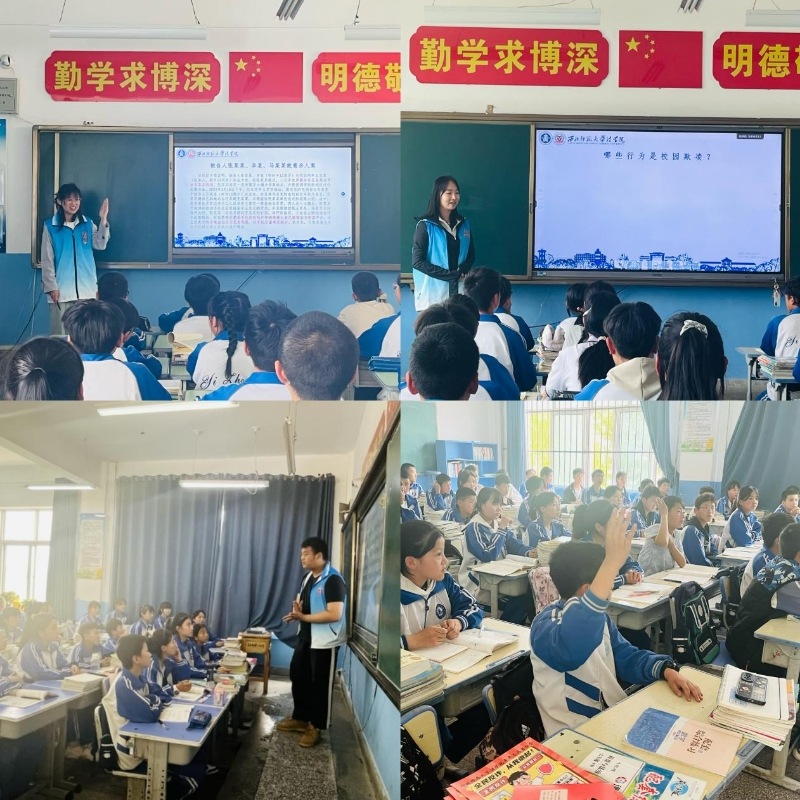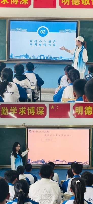普法课堂宣讲通过两部分内容展开:一是关于校园欺凌问题,志愿者向中学生深入剖析了校园欺凌的成因、危害以及预防措施,通过真实发生的校园案例,阐释了校园欺凌概念的界定、常见形式以及严重危害,呼吁中学生在面对校园欺凌行为时,既要坚决地拒绝参与,更要及时向老师、家长报告,勇敢地向校园欺凌说不,携手守护校园安全;二是针对常见校园诈骗手段,如网络游戏诈骗、虚假中奖信息诈骗、冒充熟人诈骗等,详细剖析了常见的作案手法和套路,通过播放防诈骗宣传短片,引导中学生学习如何识别诈骗陷阱,提高警惕性,并讲授实用的防范技巧,切实提升同学们的防诈免疫力,筑牢财产安全防火墙。